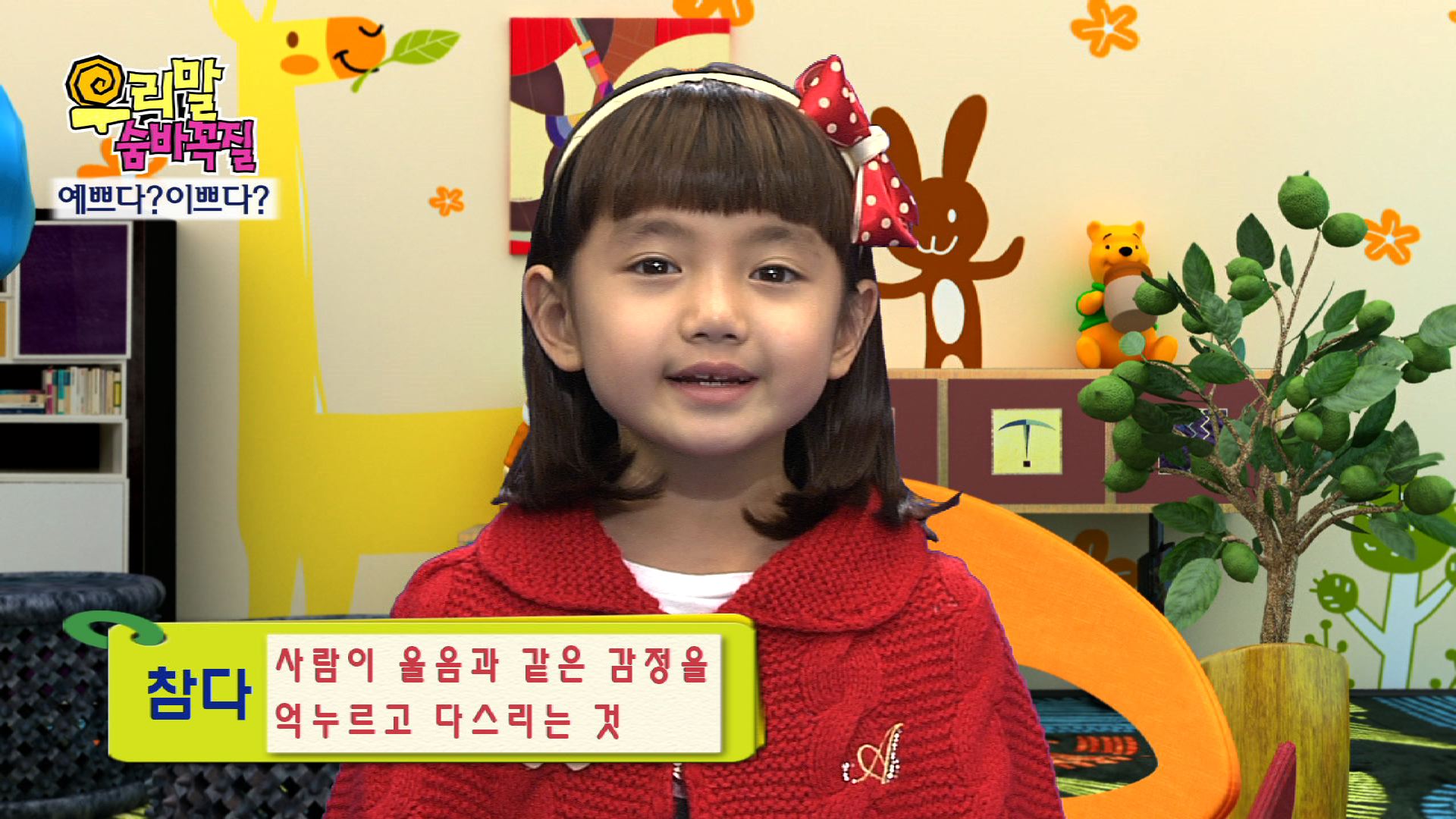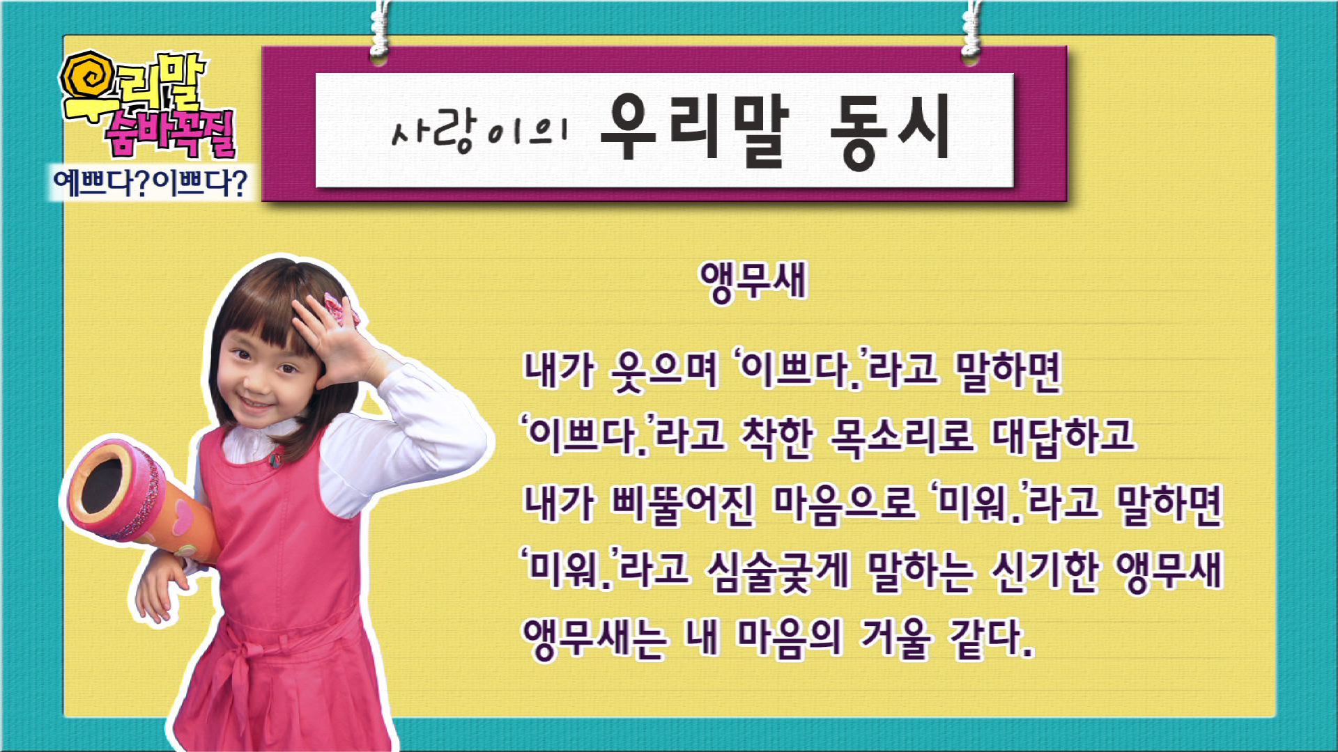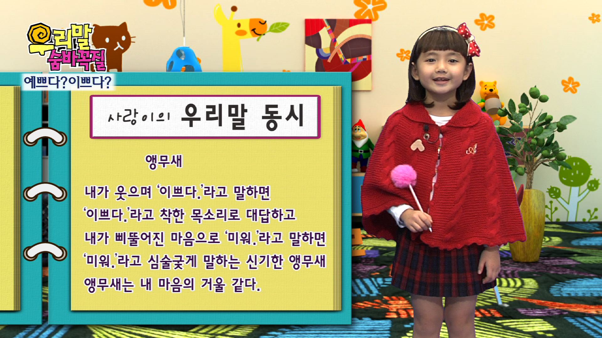 알쏭달쏭 숨어있는 우리말 찾기!아역배우 사랑이와 함께하는 쉽고 재미있는 우리말 나들이~평소 우리말을 쓰 면서도 그 뜻이 알쏭달쏭하게 여겨졌던 단어나 표현의 올바른 의미를 알아본다. 또한, 어른들도 일상생활에서 함부로 쓰고 있는 외래어, 은어, 비속어, 인터넷 용어 등을 아름다운 순 우리말로 다듬은 표현으로 알려준다.